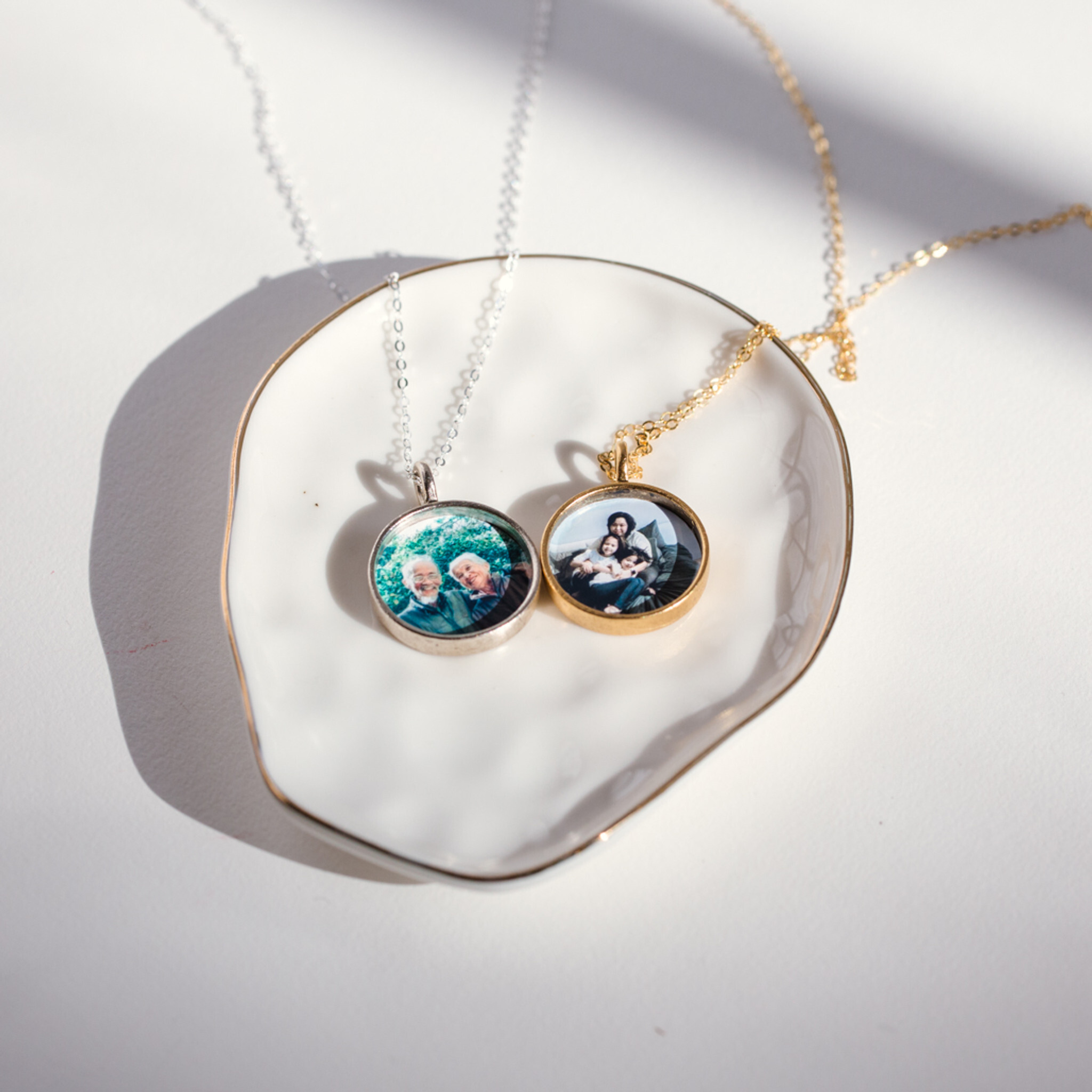 Open pendants display the photo on the front and/or back, so kids can see the image every time they look down. These are wonderful for little ones who find comfort in seeing a loved one’s face throughout the day.