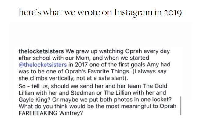 When my sister and I started the Locket Sisters almost 8.5 years ago, she had a goal of catching Oprah's attention so we could be one of “Oprah's Favorite Things", which I once read has a buying power that lasts two years. TWO YEARS! That means that anything that Oprah added to her annual list of gifts for one studio audience impacted us as shoppers for two more years beyond the air date of that episode. This information, matched with the legacy of Oprah Winfrey's voice in our childhood home, and then sprinkle on my sister's willingness to dream really, really big, meant why wouldn't we send her a locket?